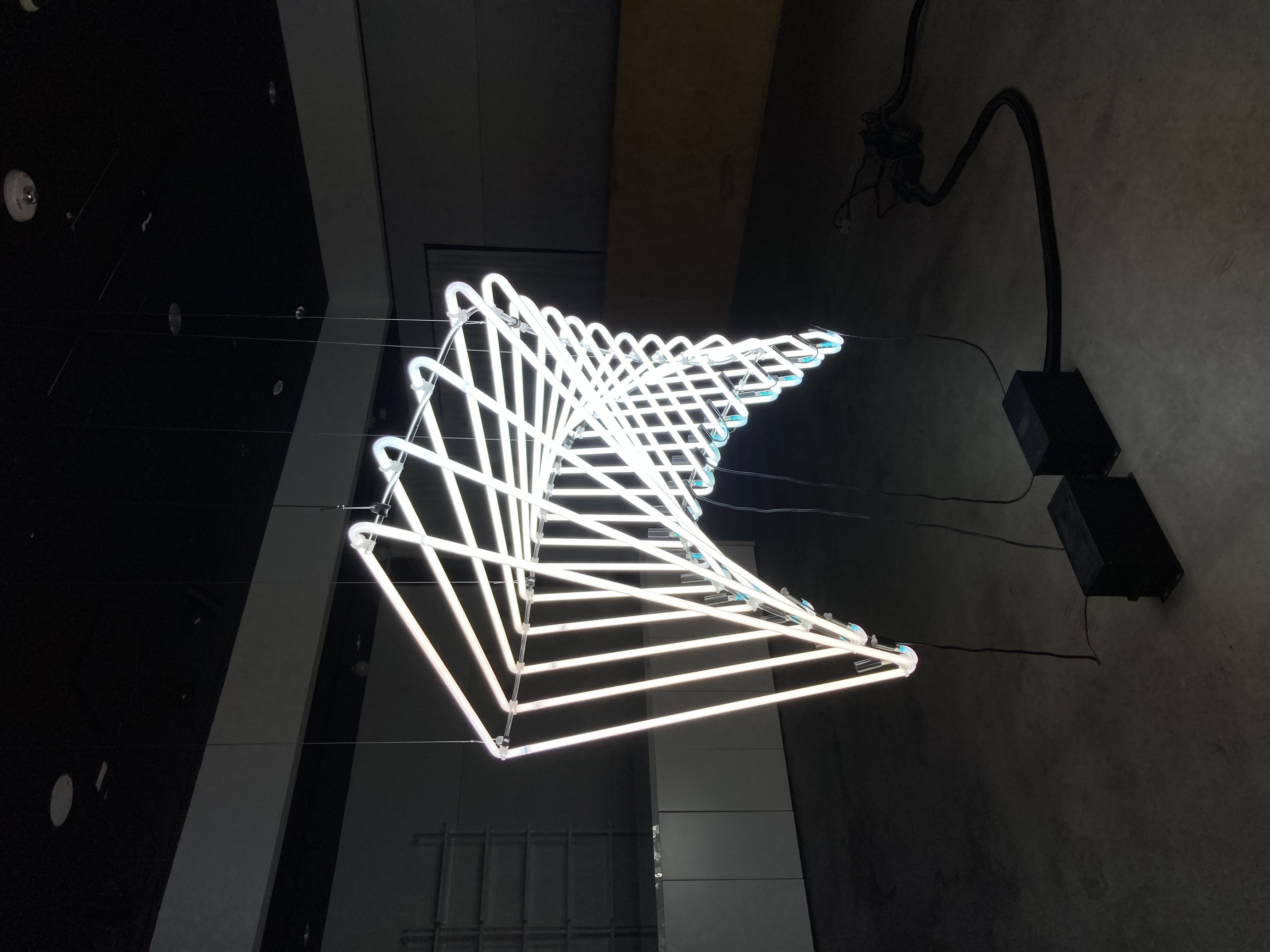 Donna Gough’s latest work, Thoughts About Time, In Space is a 16 piece neon sculpture measuring 60 inches long by 45 inches high and 38 inched deep of bent glass elaborately suspended from the ceiling by a system of wires and hand crafted connectors undetectable to the naked eye at the viewing distance.