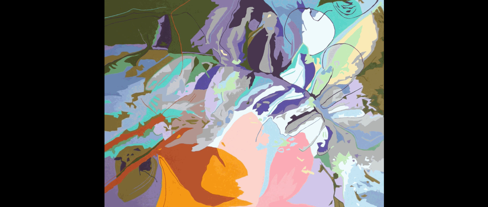 It is this grace which is worthy of examination. That, prima facie, hazardous lines admixed with the smooth brushstrokes of solid colors creates a pseudo-maelstrom on the canvas. And yet, it is in the quietude of this commotion which provides us with an enjoyment of harmless movement. After all, is that not what virtually all plant life is? Moving not toward invading another life-force, but seeking to achieve its own ends of growth and therefore more living? So the kaleidoscopic vividness created, with a certain quality of softness, demonstrates an immense balancing of the idea of life-force altogether, providing a celebratory remark in the artists attempts. She has vigorously succeeded.