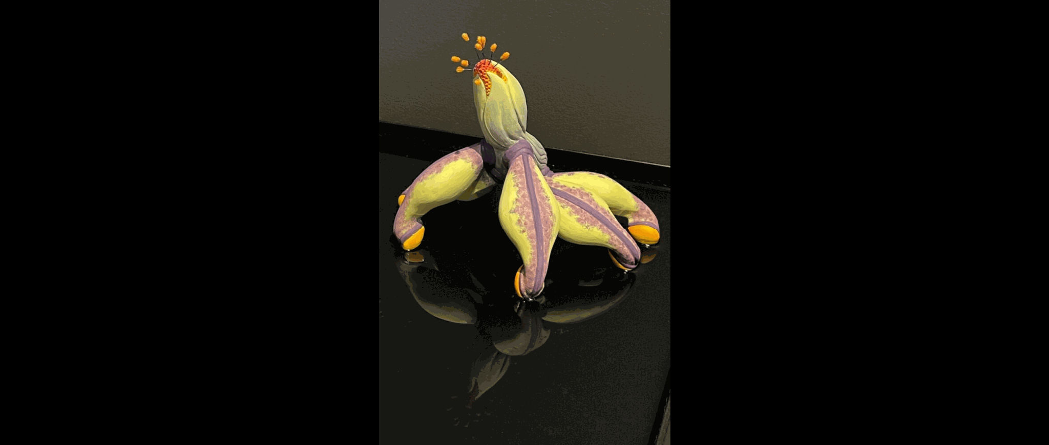 ‘Spring Narcissist’ by Cj Jilek. Ceramic, Underglaze, Flocking, Monofilament, Millinery Elements