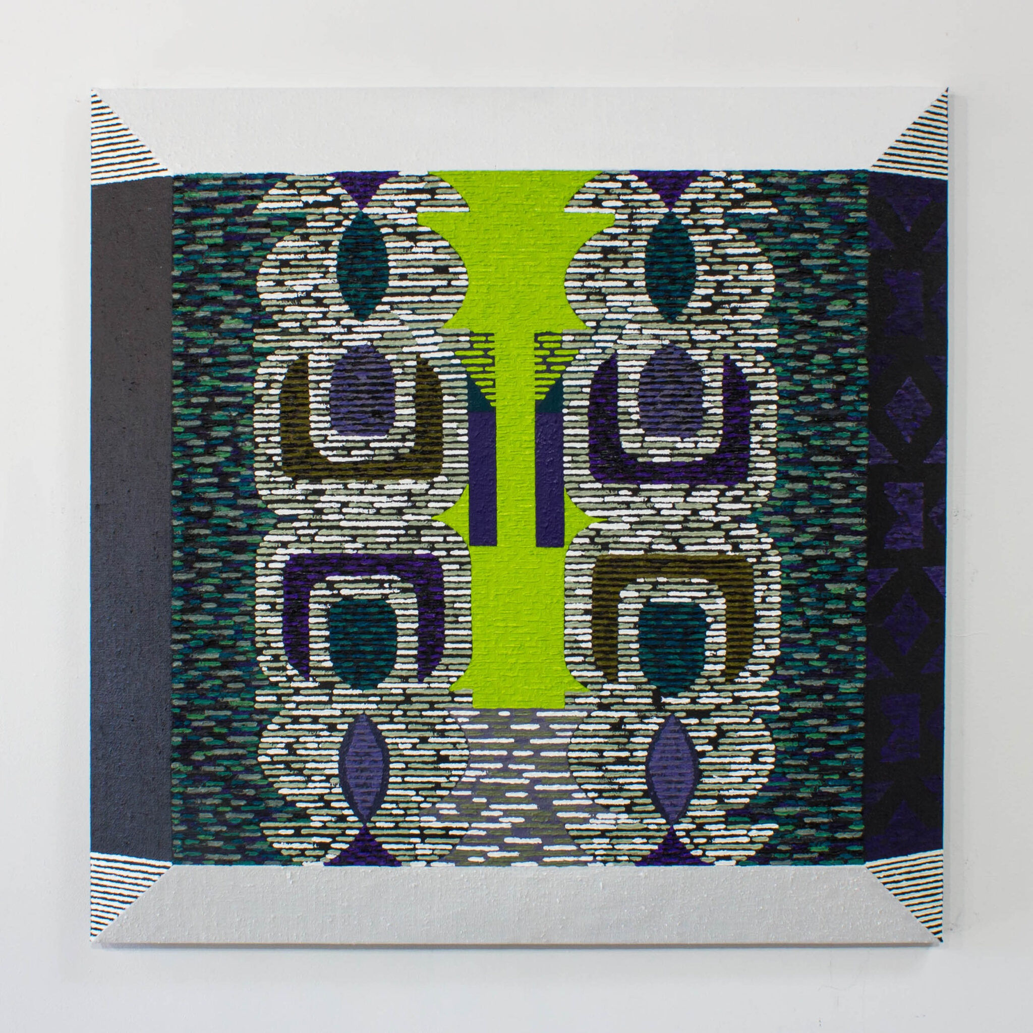 Oil and spray paint on beveled canvas